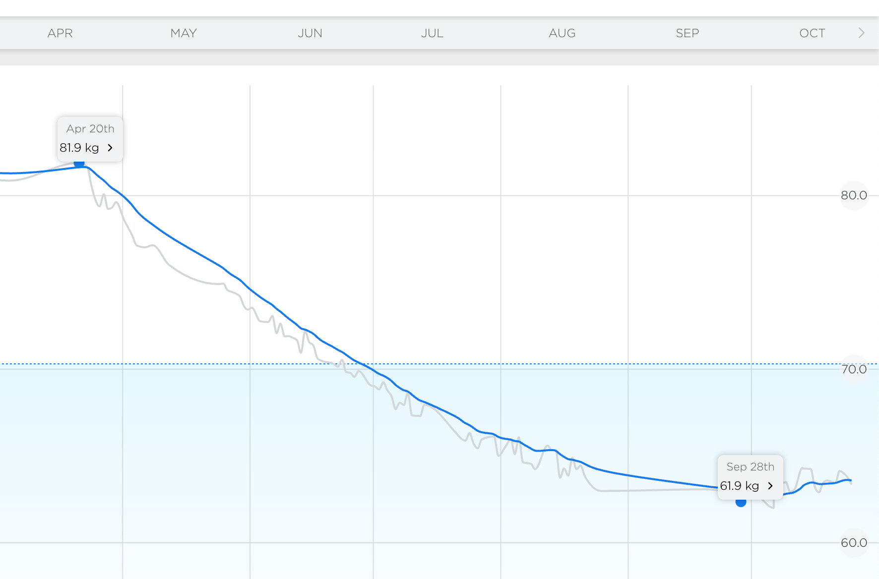 The screenshot above is my weight graph from my Withings scale. I can recommend a device like that, it updates your information without you having to input it manually. A few details aside 1, I hope it paints a pretty clear picture.